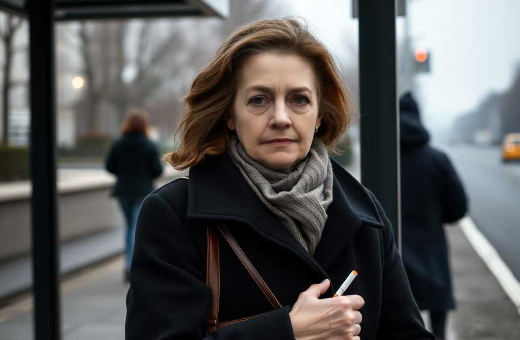 На остановке у старого рынка, где ветер гнал по тротуару желтые листья и пыль, стояла женщина, пряча сигарету в ладони. В другой руке — потрепанная сумка, набитая до отказа, будто в ней уместились все ее заботы. Она стояла у края дороги, не глядя на расписание, будто не ждала автобус, а просто искала хоть каплю твердой земли под ногами в этом бесконечном потоке дней.