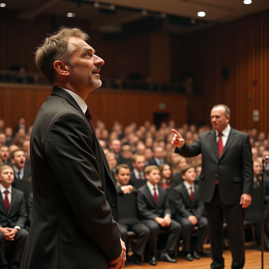 Он сидел в первом ряду, в старом костюме, который помнил не одну стирку: потертые локти, слегка распущенные швы на воротнике, галстук купленный в ближайшем ларьке. Ростом он был ниже среднего, глаза тёмные, внимательные, но в них читалась усталость от постоянного напряжения; плечи сутулились, будто на них лежало обязательство не привлекать внимания. Он держал руки сложенными на коленях, пальцы с ссадинами от подработок, и смотрел на сцену так, будто искал там своё место, которого никогда не было. Люди в новых костюмах бросали на него быстрые взгляды — с пренебрежением и интересом одновременно.