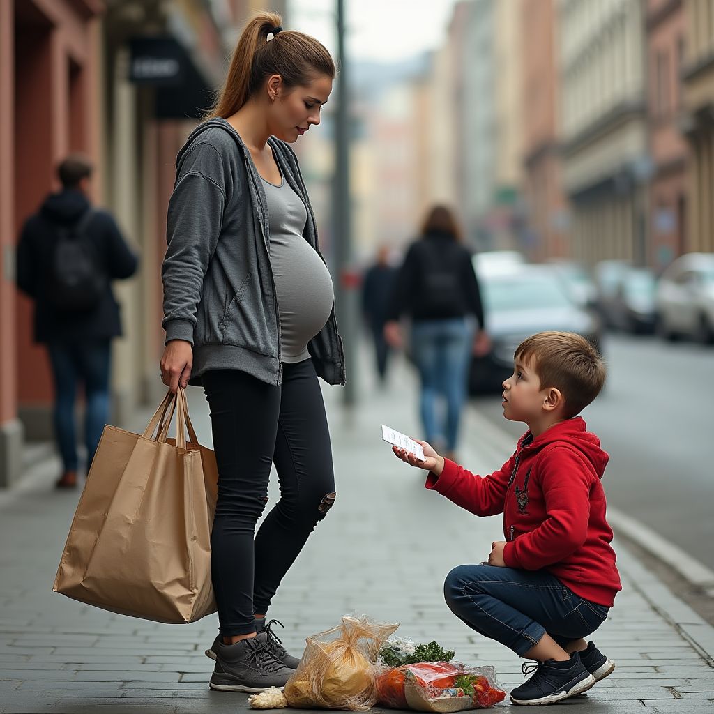 Её ладони мелко дрожали, словно опавшие листья; по щекам пробежала жаркая волна стыда. «Какой я пример для ребёнка?» — думала она, и голос внутри звучал громче чужих слов. Пальцы сжали пакет сильнее, дыхание учащалось, мурашки бежали по коже от холода и оттого, что никто не остановился, никто не помог. Сердце билось так, что казалось: все слышат его, а мир продолжал идти мимо.