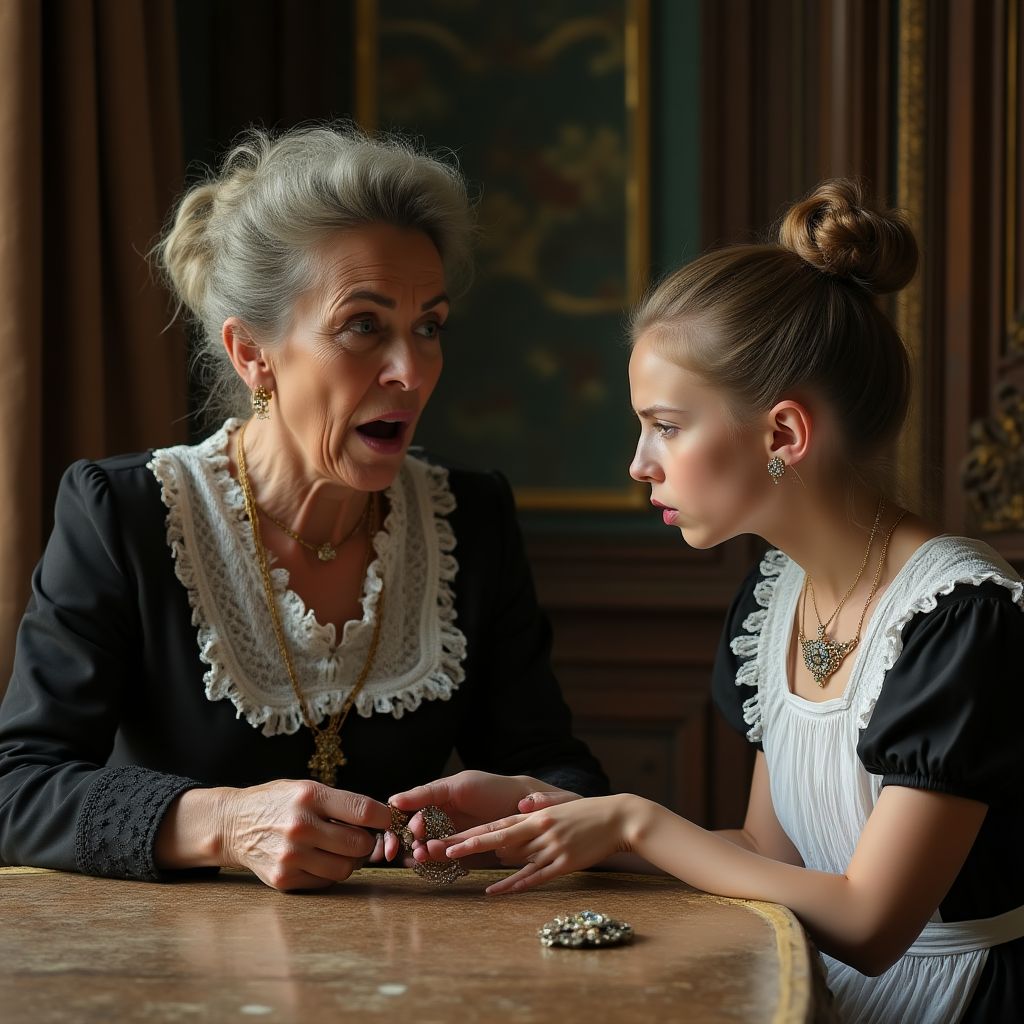 Она стояла прямо, как статуя: рост средний, плечи выпрямленные, глаза карие, но в них был такой оттенок уставшего превосходства, который приходит с годами власти и деньгами. На ней было платье дорогого кроя, перчатки, безупречная причёска — всё говорило: Маргарита привыкла к тому, что мир кланяется ей прежде, чем задаст вопрос. Руки её были идеальны, ногти — аккуратные, манера говорить — короткая, как команда. Перед ней, на низком стуле у окна, тихо сидела Анна в простой сукне: волосы собраны в тугой узел, пальцы шершавые от труда, взгляд ровный, но глаза блестели, будто в них таилась вода. Контраст был явным: богатая холодная уверенность против сдерживаемой бедности и усталости. Анна пришла вечером убрать посуду, словно пришла на маленький ритуал, где её роль уже предначертана.