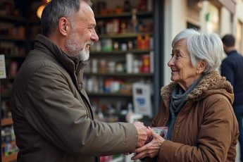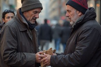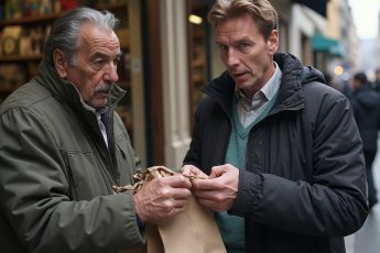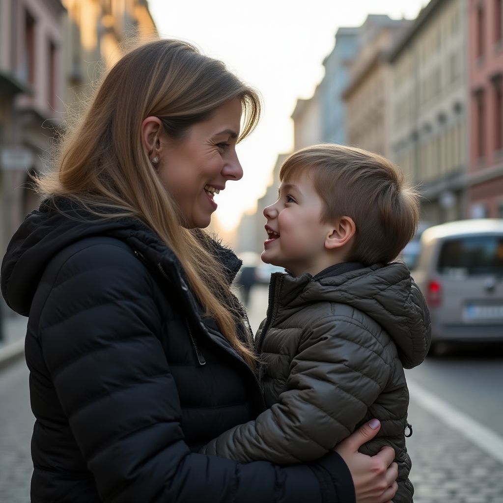 Прохожие остановились, наблюдая за этой неожиданной сценой. Вокруг раздались тихие вздохи и обсуждения, словно сама улица держала дыхание. Мать опустила взгляд, слёзы начали катиться по её щекам.