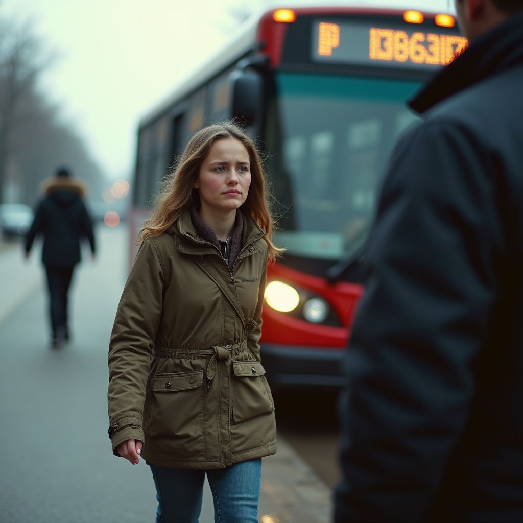 Вдалеке показался автобус, медленно приближаясь к остановке. Водитель выглянул из кабины и посмотрел на девочку. Его взгляд был холоден и пронзителен. Её сердце внезапно застыло, и вся окружающая суета затихла, словно время замерло. Казалось, что он видит в ней что-то, что она сама не хотела показать.