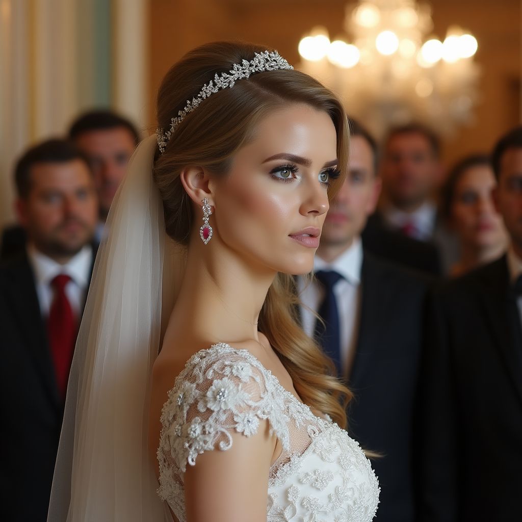 В центре внимания стояла она — невеста с длинными сверкающими темно-каштановыми волосами, собранными в элегантную прическу. Её глаза, цвета молодой грозы, переливались сомненьем и скрывали волну эмоций, которую никто не мог понять. Белоснежное платье, сшитое из тончайшего кружева, казалось слишком нежным для её усталого взгляда. Рослая, с грациозной осанкой, она словно жила в другом мире, где другие правила — мир, в котором разрыв между внешним блеском и внутренней драмой стоял на грани.
