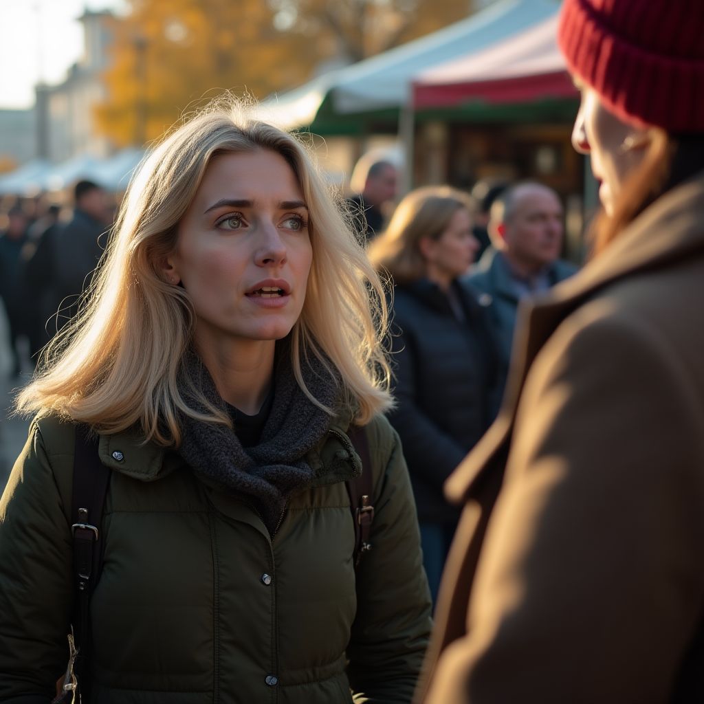 Елена была невысокой женщиной с тусклыми карими глазами и длинными тёмными волосами, собранными в запутанный пучок. Она носила старую, но аккуратную куртку, явно купленную на распродаже, и потертые джинсы, излучая скромность и уязвимость. Её худощавое лицо отражало усталость и тревогу, словно годы борьбы оставили незримые морщины на душе, а её осанка чуть пригибалась под невидимым грузом забот. Вокруг неё суетились продавцы и покупатели, разнообразие которых ярко подчёркивало социальную пропасть, в которой она жила. Елена с некоторой осторожностью наблюдала за движениями, словно пытаясь привыкнуть к этой части города, куда слишком редко заглядывала.