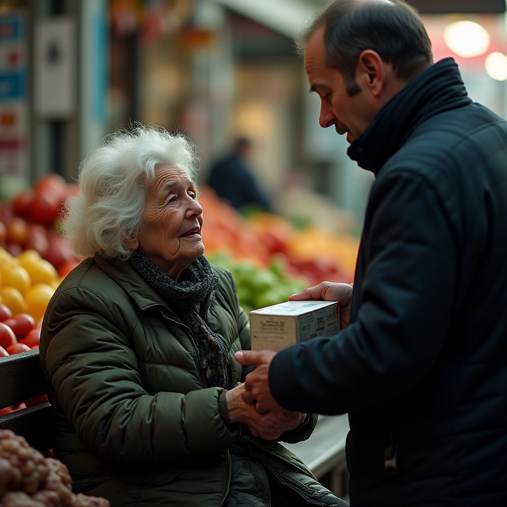 Люди вокруг начали переглядываться, слыша их диалог. «Кто он такой?» — прошептал один из торговцев. «Наверное, мошенник,» — ответил другой, отвернувшись. «Или просто очередная беда,» — добавила пожилая женщина, взглянув на бабушку с жалостью. Шёпоты множились, взгляды становились напряжённее, а бабушка с коробкой продолжала сидеть, словно глубоко задумавшись.