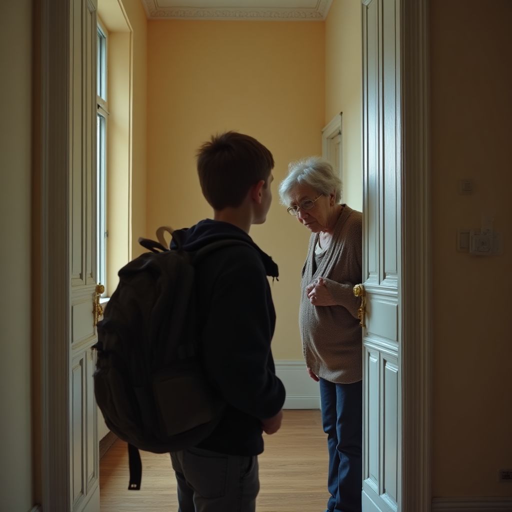 Мальчик вздрогнул, услышав голос женщины, и взгляд у него стал настороженным. Его руки слегка дрожали, как листья на ветру, а дыхание стало учащённым. Сердце билось так громко, что, казалось, слышалось всем вокруг. Внезапно появившийся интерес соседей усилил напряжённость, и на площадке стала нарастать смешанная атмосфера тревоги и любопытства.