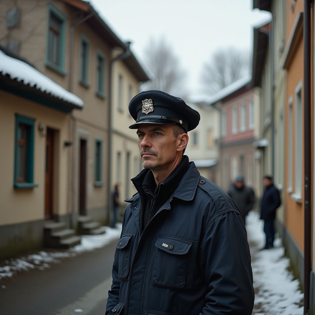 Мужчина средних лет, высокий и худощавый, с глазами цвета пасмурного неба, выглядел не похожим на местных жителей. Его рабочая форма была чистой, но в уголках рта застыла лёгкая усталость, отражавшая долгие годы труда без признания. На лице — глубокие морщины, будто карты пережитого, а руки аккуратно держа папку с письмами, выдавали привычку бережного отношения к долгам. Пошатываясь на старых кожаных ботинках, он явно не принадлежал к этому району, и это ещё больше подчёркивало разрыв между ним и мрачным окружением, где нищие и подавленные лица скрывались в тени.