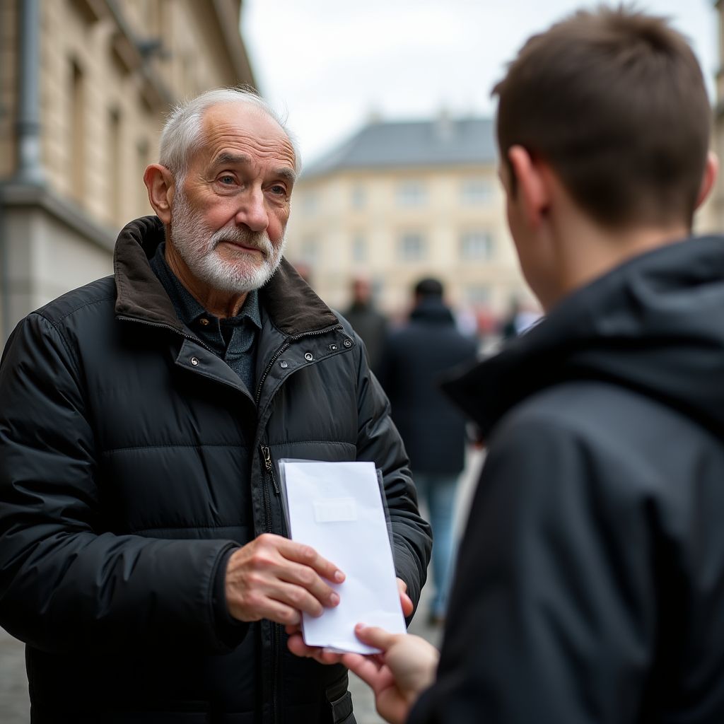Пожилой мужчина с дрожью в руках стоял у края тротуара, возле старого автобусного остановочного павильона. Его пальцы сжимали пожелтевший конверт, который он медленно протянул молодому прохожему, мужчина склонил голову, заставляя глазами сузиться от напряжения. В этот момент всё вокруг словно притихло, пространство наполнилось ожиданием и тревогой. Было видно, что мужчина устал не только телом, но и душой, а на его лице — следы прожитых бед и разочарований.