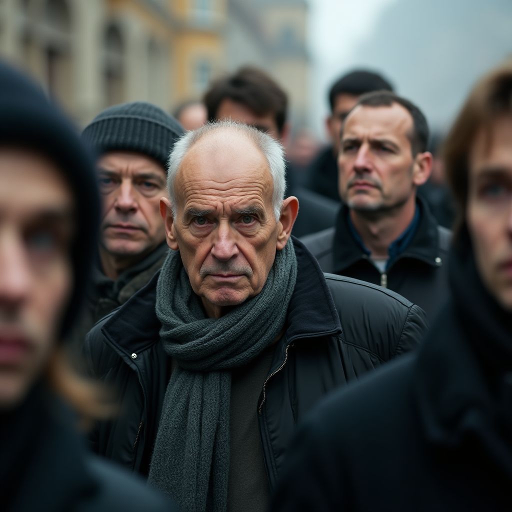 В толпе выделялся он — пожилой мужчина в короткой потёртой куртке, с сединой, пробивающейся сквозь редеющие волосы, и прожжённым морщинами лицом ветерана. Его глаза, глубокие и усталые, внимательно скользили по окружающим, будто пытаясь найти кого-то конкретного. Высокий рост и уверенная осанка выдавали прежнего военнослужащего, а скромная одежда и изношенные ботинки — человека, который за долгие годы многое пережил, но не утратил достоинства. Вокруг него мельтешили молодые и старые, бедные и менее бедные — разнородная масса, которую он наблюдал с лёгкой грустью.