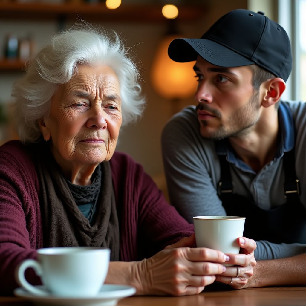Молодой официант, высокий парень с небритым лицом и в простой форме, пытался занять коллегу разговором, но его взгляд всё чаще задерживался на старушке. Его сердце сжалось от чего-то знакомого и тревожного. Сердце стучало быстрее, словно предупреждая о чём-то. Что заставило этот хрупкий силуэт опустить голову и расплакаться именно здесь, среди чужих? Его внутренний голос шептал: «Я должен узнать её историю». Решившись, он подошёл к столу осторожно.
