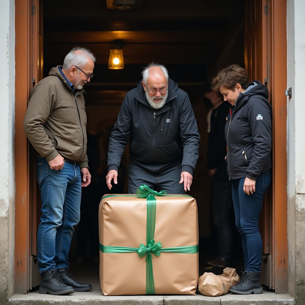 Старик глубоким вздохом внутренне боролся с желанием отвернуться от всего этого. «Неужели я так мало значу?» — думал он, стеная от боли, пробирающейся внутрь. «Но этот подарок — нечто большее. Придет время, и всё изменится.» Он медленно наклонился к свертку, собираясь открыть его, когда вдруг почувствовал, что все взгляды устремлены на него. Сердце билось бешено, дыхание сбилось, а ладони вспотели. «Что там внутри? Должен ли я показать людям эту тайну?» — мысли беспокойно кружились в голове.