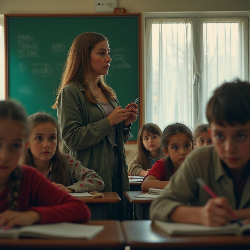За массивной дверью класса стояла она — учительница средней школы, Елена Сергеевна. Высокая, со строгой осанкой, но усталыми глазами цвета дождливого неба, она держала в руках учебник, старый и выцветший. Её тёмные волосы были собраны в аккуратный пучок, а одежда — скромная, но опрятная, чуть поношенный свитер и юбка, что плохо скрывали признаки изнурительной работы. Несмотря на скромность внешнего вида, в её взгляде светилась болезненная решимость.