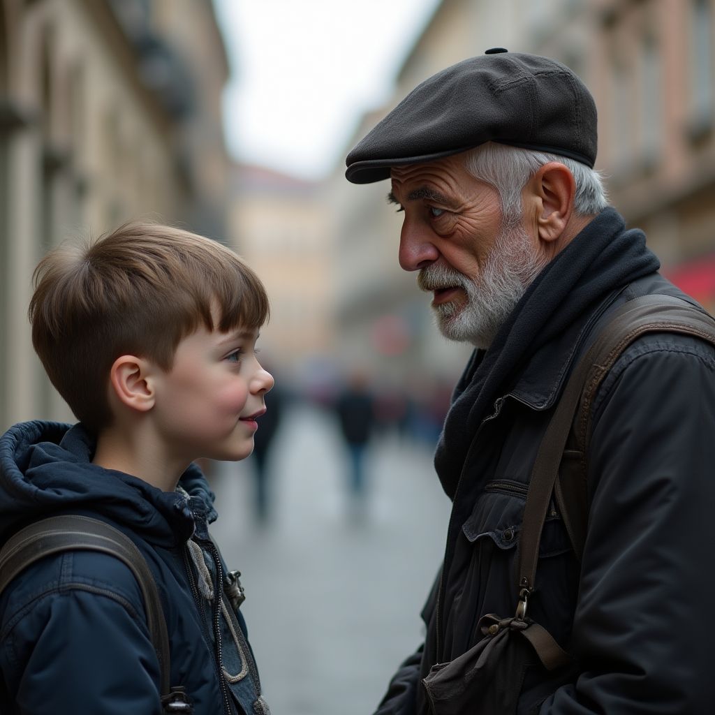 Мужчина медленно протянул руку, касаясь плеча мальчика, и произнёс хрипло: «Твои слова — это то, чего я ждал всю жизнь». Вокруг воздух будто сгустился, лица прохожих застынули в изумлении и напряжении, словно время остановилось на краю чуда. Сердце мальчика колотилось так громко, что казалось, слышат все вокруг. Он смотрел прямо в глаза бездомному, видя там не только страдания, но и большую тайну.