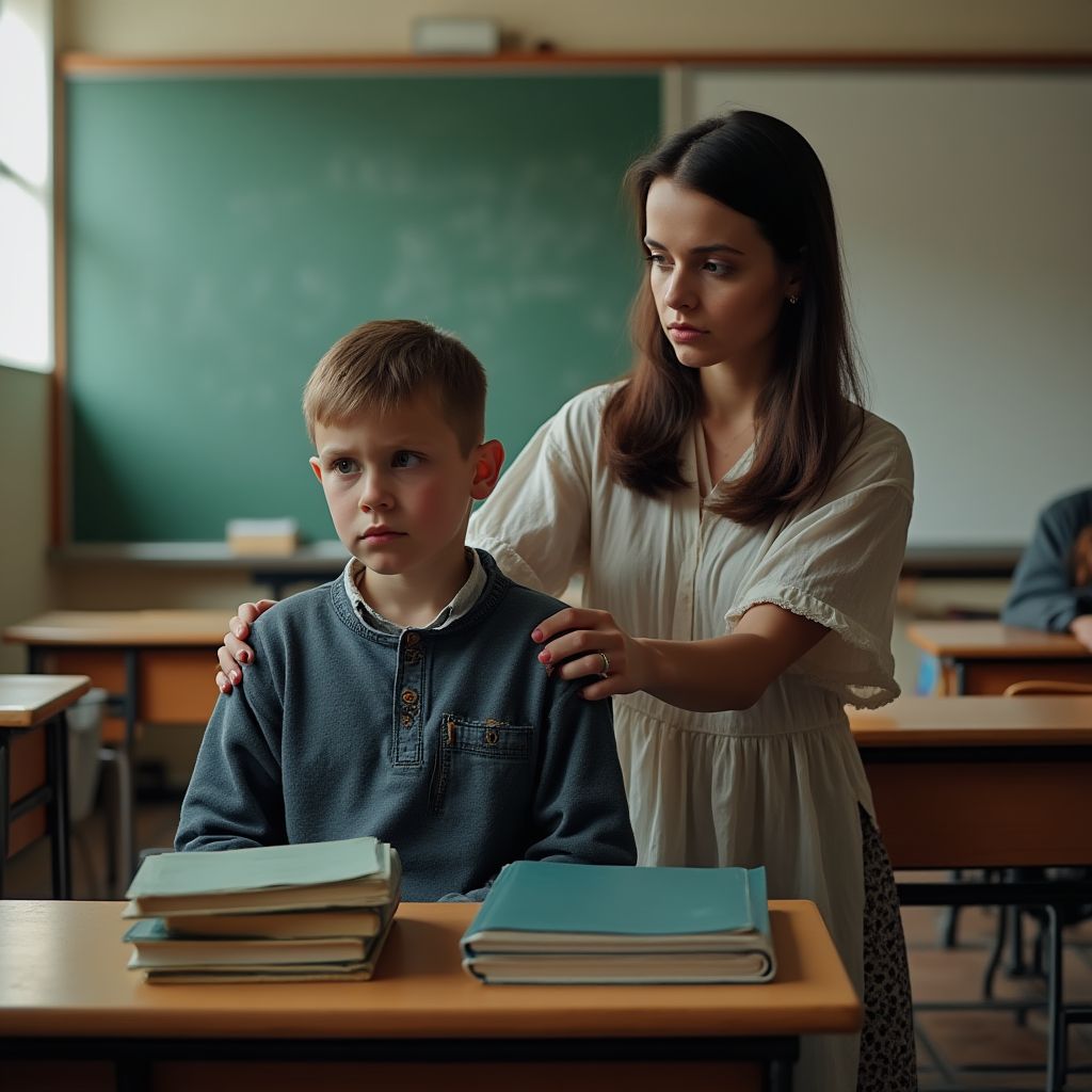 Среди детей выделялась учительница Елена — высокая женщина средних лет с усталыми глазами тёплого карего цвета. На ней была простая тёмно-синяя блузка и поношенная юбка, слегка помятая после долгого дня. Её лицо отражало заботу и усталость одновременно. Она аккуратно поправляла волосы, стараясь сохранить спокойствие в кругу детей из разных социальных слоёв, которых ей приходилось обучать. Сегодня но особенный день — она возвращала в класс мальчика по имени Ваня, которого буквально только что хотели выгнать из урока.