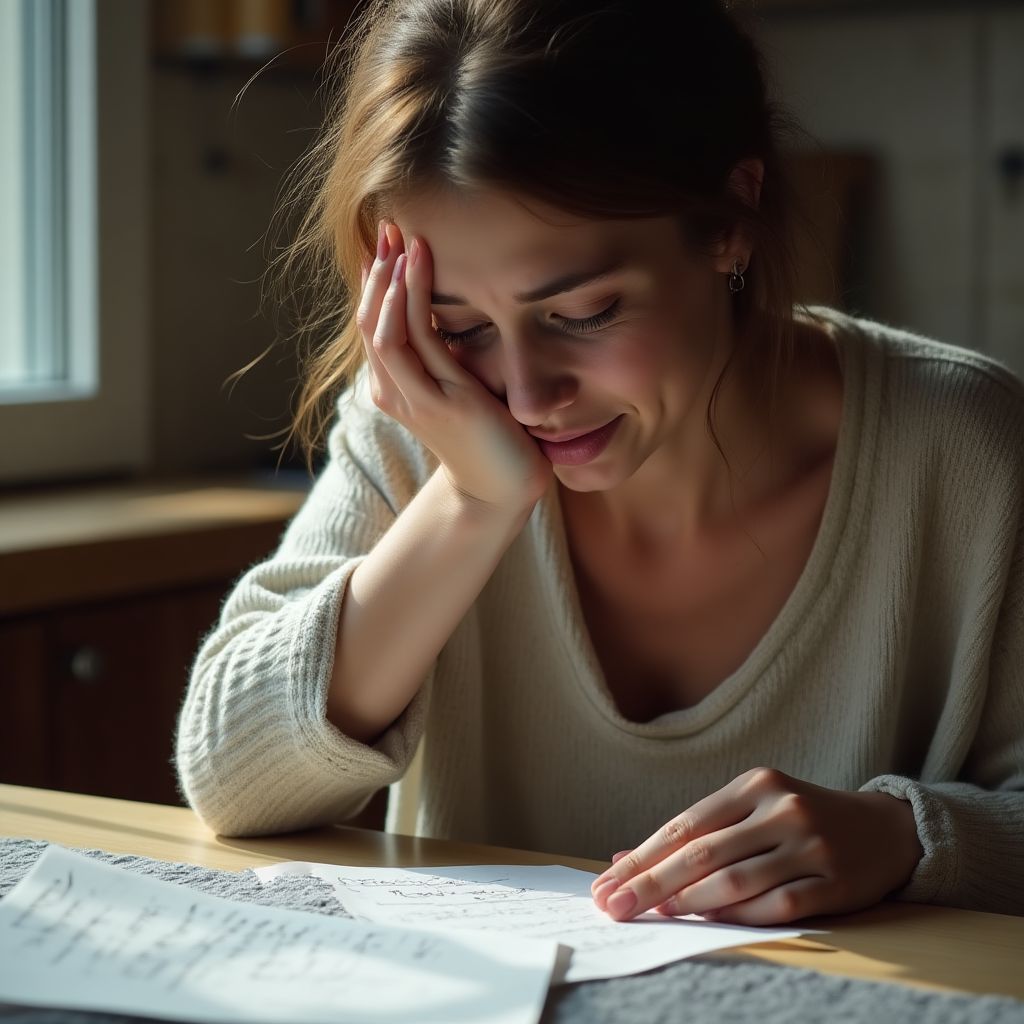 Анна сидела на деревянном стуле, слегка сутулясь, руки дрожали, а глаза были красными от бессонной ночи. Её бледное лицо с тонкими губами и усталыми глазами выдавало человека, который уже давно шёл по краю между отчаянием и надеждой. Одетая в изношенный тёмно-синий свитер и старую юбку, она казалась ещё хрупче на фоне скромной кухни. В квартире пахло старым хлебом и горящим чаем — запахами, которые напоминали ей о прежних, лучших временах.