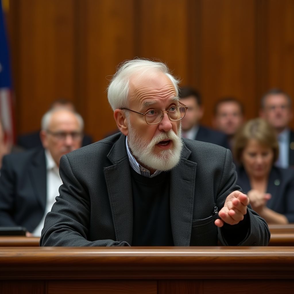 Старик, опираясь на трость, медленно подошёл к трибуне. Его кожа была морщинистой, будто тонкая пергаментная бумага. Глубокие синеватые глаза смотрели в пол, но в них горел огонёк непокорённого духа. Одет он был скромно: поношенный серый пиджак с чуть заметными следами времени, измятые брюки и слишком узкая старая рубашка, едва прикрывающая хрупкую грудь. Его осанка выдавала долгие годы тяжкого труда, а руки — дрожь и многие испытания. Он был одиноким представителем тех, кто привык жить на обочине общества.