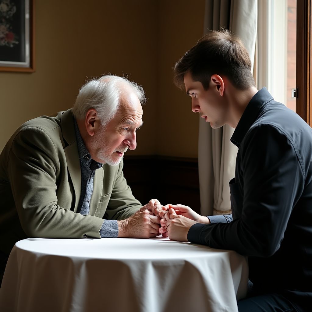 Его фигура казалась хрупкой и усталой, седые волосы небрежно растрёпаны, а морщинистое лицо скрывалось под толстой парой очков. Он был одет в старый, местами порванный плащ и потертые ботинки, которые давно потеряли былую форму. Руки дрожали от холода и, возможно, от внутреннего волнения. Официант, молодой парень с аккуратно зачесанными тёмными волосами и в чистой рубашке, заметил старика и тихо подошёл, улыбаясь сдержанно. Глаза старика вдруг встретились с глазами официанта — в этот миг казалось, что всё в комнате замерло.