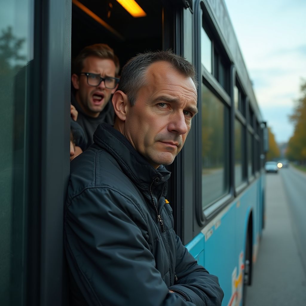 Мужчина с папкой взглянул в окно, где мимо неуверенно шагали прохожие, все озабочены своими делами и заботами. Он почувствовал, как изменилась атмосфера внутри автобуса — от жёсткой безразличности к человечности и решимости. «Пора перестать быть зрителем», — думал он.