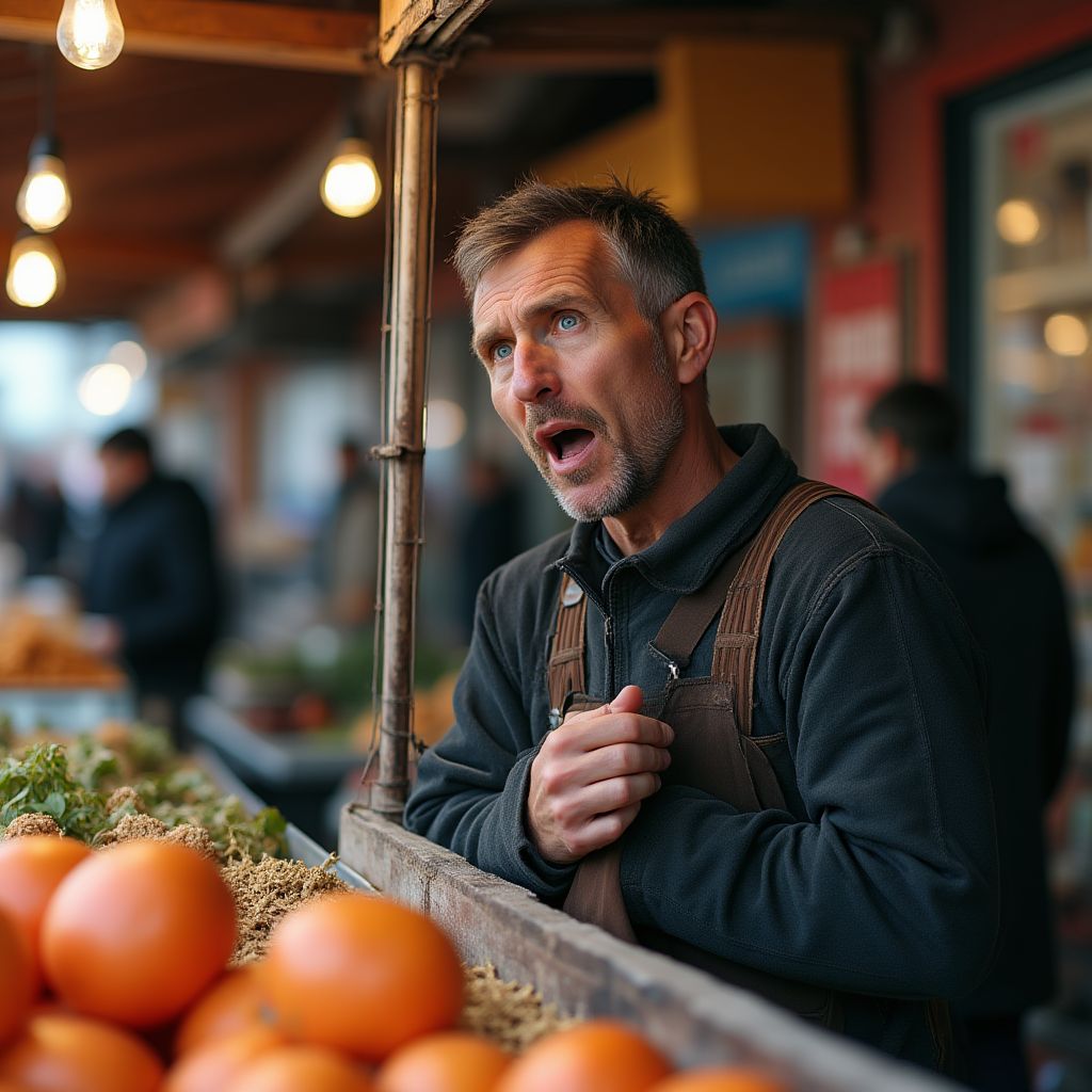 На углу рынка, возле старенькой палатки с овощами, стоял пожилой мужчина — Иван Петрович. Его седеющие волосы густо пролегали по лбу, а одежда — смена потёртой куртки и грязноватых старых джинс — говорила о скромных доходах. Его глаза — глубоко посаженные, с тенью усталости — наблюдали за потоком прохожих с лёгкой настороженностью. Каждое движение было выверенным, будто боялся лишнего внимания. Иван Петрович был простым продавцом, живущим на улице уже десятилетиями; его лавка была неотъемлемой частью рынка, но теперь она казалась словно чёрной дырой в окружении ярких прилавков. Он смотрел на свою карту из редких покупателей с тенью грусти и усталости.