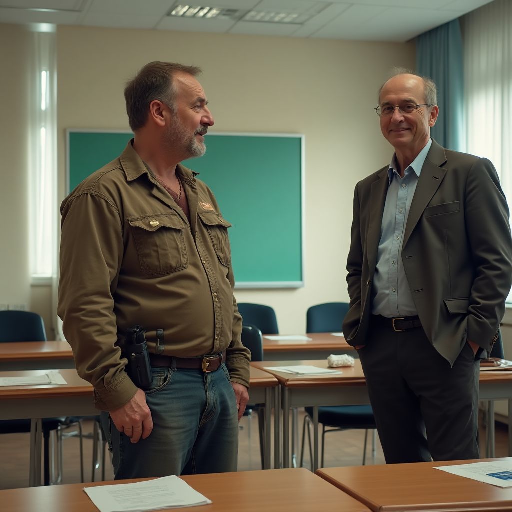 На пороге учительской стоял мужчина лет тридцати пяти, одетый в иссохшую ветхую куртку и поношенные брюки, испачканные грязью и пылью. Его высокий рост и широкие плечи контрастировали с усталой осанкой и бледным лицом с тусклыми глазами, устремлёнными вниз. Волосы, спутанные и грязные, ещё больше подчёркивали социальное неравенство, будто он был из другого мира, чужим среди идеально одетых родителей и учителей. Его обувь скрипела на линолеуме, а дрожь в руках выдавала нервозность и страх перед предстоящей встречей.