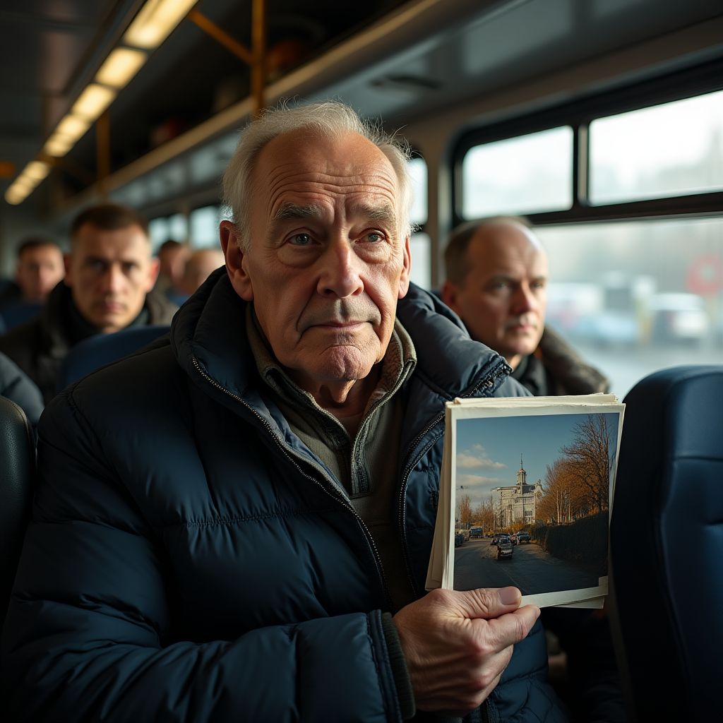 В глубине салона сидел пожилой мужчина. Его седеющие волосы были аккуратно зачёсаны назад, а глубокие морщины на лице казались картой пройденных испытаний. Застёжка облезлого пальто была прикреплена неровно, а потертые ботинки плотно обхватывали тонкие ноги, словно держали страх не отпустить. Он сдержанно вглядывался в руки, держа туго стиснутое маленькое фото, как будто в нём заключалась последняя надежда. Глаза мужчины блестели смесью усталости и скрытой боли, нависающей над его сгорбленной фигурой.
