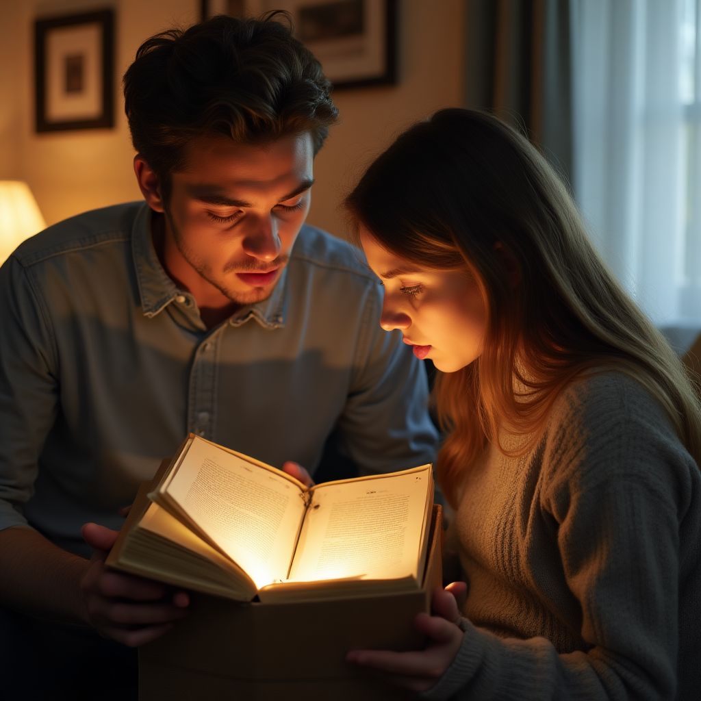Он медленно, почти тревожно, начал открывать коробку. С каждой секундой его пальцы дрожали всё сильнее, дыхание стало учащённым, а сердце будто подсказывало — сейчас случится нечто важное и страшное одновременно. В глубине коробки лежал потрёпанный кожаный дневник, обложка которого была облуплена временем. Воздух наполнился затхлым запахом старой кожи и бумаги, от которых мурашки пробежали по коже. Он не мог отвести взгляд: что же скрывает в себе этот дневник его матери? В этот момент комната словно замерла, каждый звук стал отчётливее, каждая тень глубокая и тревожная.