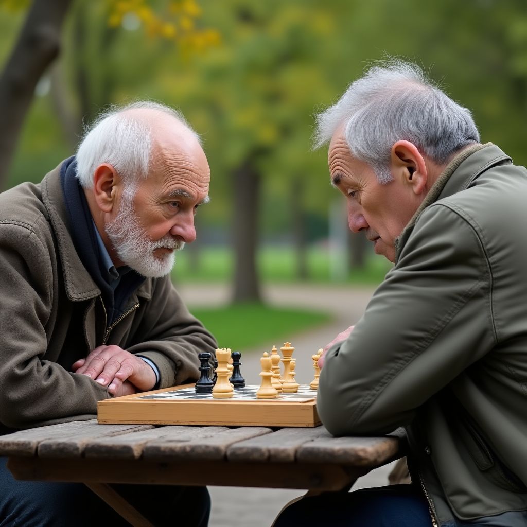 Среди них выделялся седовласый мужчина по имени Иван Петрович, чей измождённый, но гордый взгляд отражал годы испытаний. Его тусклые голубые глаза слегка примыкали под тяжестью накопленных воспоминаний, а кожа была покрыта сетью тонких морщин, словно карта пережитого страха и боли. Ветра колыхались вокруг его поношенного пальто, которое он всегда носил даже в тёплую погоду, напоминая о скромном происхождении и постоянной нужде. Его неуверенные руки слегка дрожали, когда он передвигал пешки и ладьи, словно стараясь удержать нечто ценное — не только фигуры, но и последние части себя.