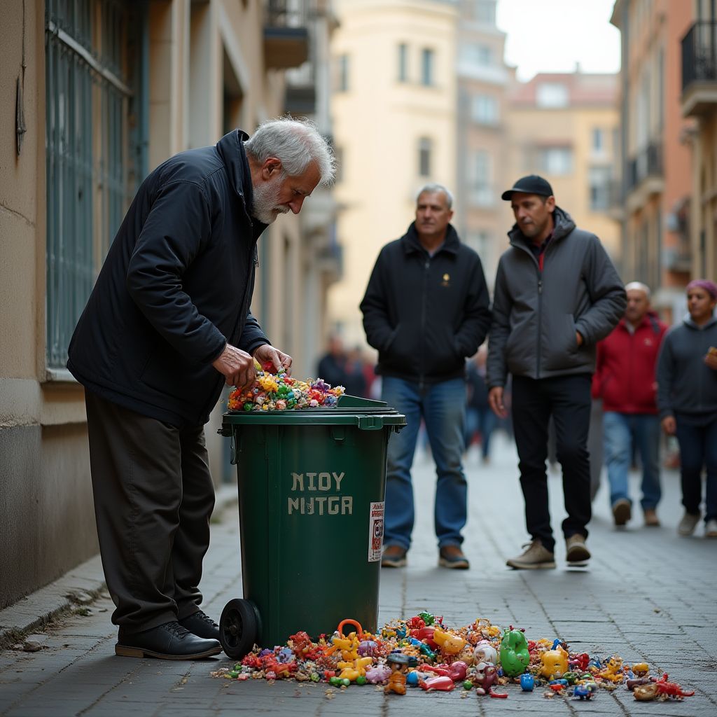 Сегодня он пришёл пораньше, чтобы подготовить двор к подготовке к зиме. Его тихие шаги отражались эхом по пустому двору, а взгляд невольно упал на мусорный бак, возле которого валялись разбросанные детские игрушки — яркие, но покрытые слоем грязи, забытые кем-то в спешке или ненужные. Внезапно он остановился, присев на корточки, и начал собирать эти игрушки, его пальцы осторожно сгребали их одну за другой.