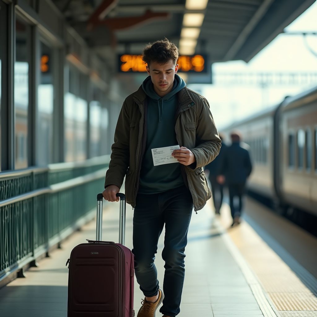 Он стоял у табло, высокий, но будто сгорбленный от невидимого груза. Волосы тёмные, руки с мозолями, куртка пережитая, но чистая — человек, который выучил экономить на всём, кроме обязательств. Его глаза были серые, внимательные, с синевой усталости под нижними веками; он держал в руках бумажный билет, а в кармане — чужая надежда и решимость. Казалось, что этот вагон обещает не бегство, а спасение, и он смотрел на расписание как на редкую возможность начать заново.