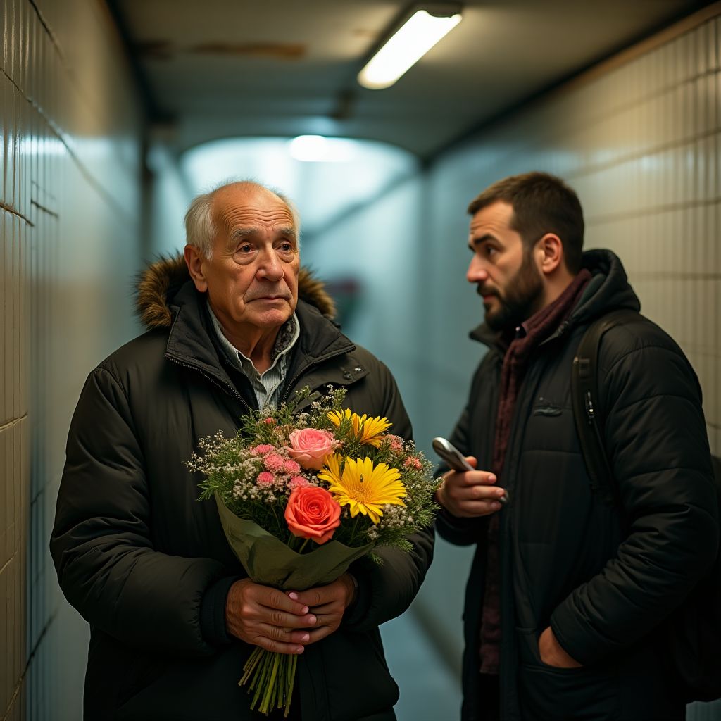 У выхода из метро, под слегка покосившимся навесом, в тени холодных неоновых ламп стоял пожилой мужчина. Его хрупкая фигура была накрыта ветхой, но аккуратно заштопанной курткой. Седые волосы выбивались из-под простой шапки, а глаза, усталые и влажные от моросящего дождя, блестели в тусклом свете. Руки его слегка дрожали, сжимая небольшой букет полевых цветов — невзрачный, но живой, словно напоминание о чём-то дорогом и утраченном. Его обувь — изношенные ботинки, давно потерявшие блеск и форму; одежда — скромная, будто перекликающаяся с обыденностью и забвением, в котором он жил.