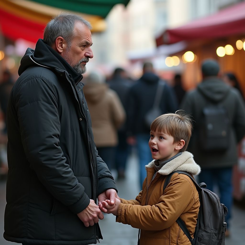 Мужчина крепко сжал детскую руку, а в глазах его горел решительный огонь. Дрожь пробежала по телу, сердце било как молот, дыхание участилось. Казалось, весь рынок замер — момент длился вечно. Он понимал, что этот шаг изменит судьбы — как свою, так и многих вокруг.
