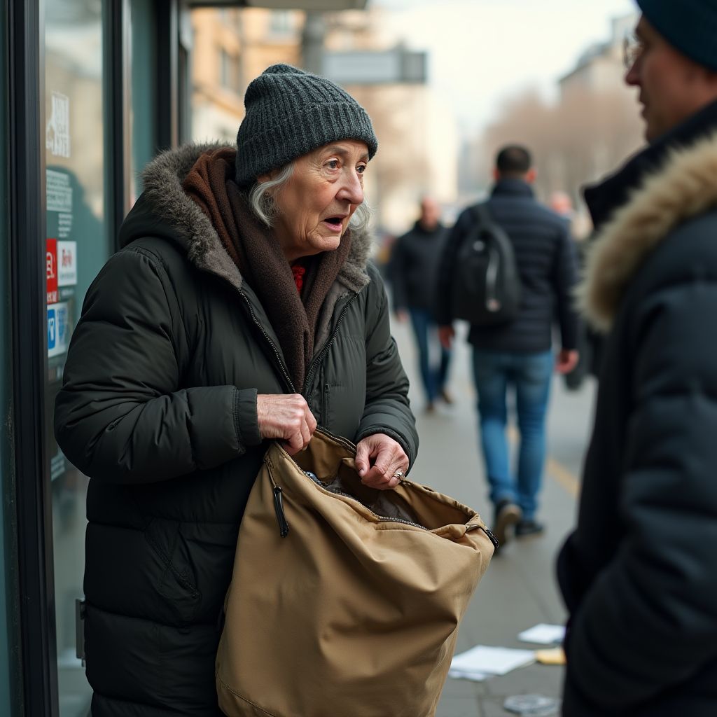 «Где сумка?» — громко спросил продавец лотка, выглянув из-под тёплого света. «Кто-то видел?», — перебивала молодая девушка в чёрной куртке. «Возможно, на том газоне», — сказал мужчина в синей рабочей куртке. «Она была так бедна, там были её документы», — прошептал рядом старик. Голоса сливались, каждое слово ударяло по старушке, как ледяная вода.