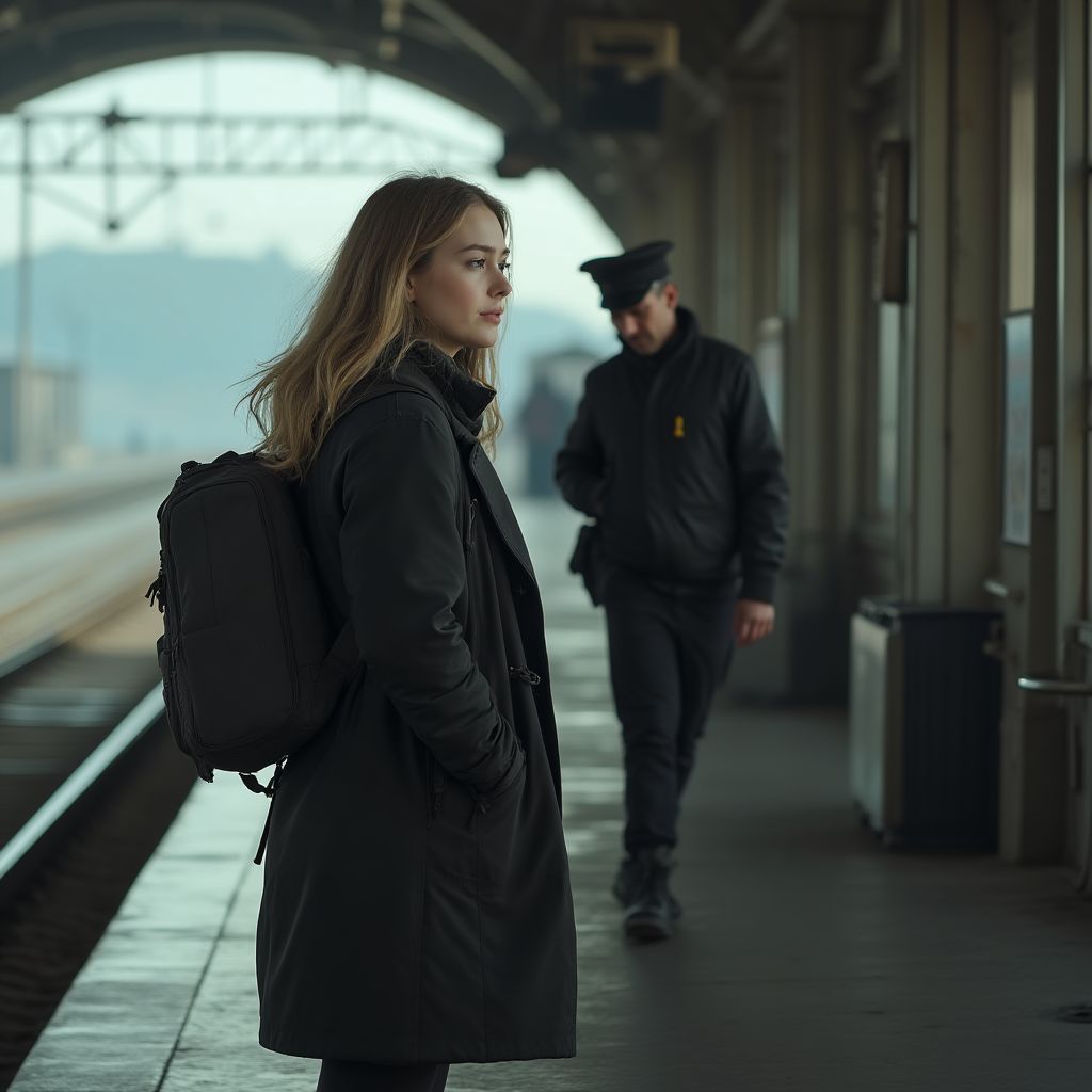 На одном из мраморных скамеек, покрытых тонким слоем влаги, сидела девушка. Её тонкая фигура, окутанная слишком лёгким плащом, казалась уязвимой на фоне бетонных стен вокзала. Прическа слегка растрёпана ветром, в глазах — смесь усталости и напряжённого ожидания; губы прикусила в знак внутренней борьбы. Свет фар приближающегося поезда отражался в её больших карих глазах, делая их ещё глубже и загадочнее. В отличие от шумных толп и спешащих пассажиров она словно растворялась в одиночестве, подчеркнутом дешёвой, но аккуратной одеждой и скромной сумкой, свисающей с плеча.