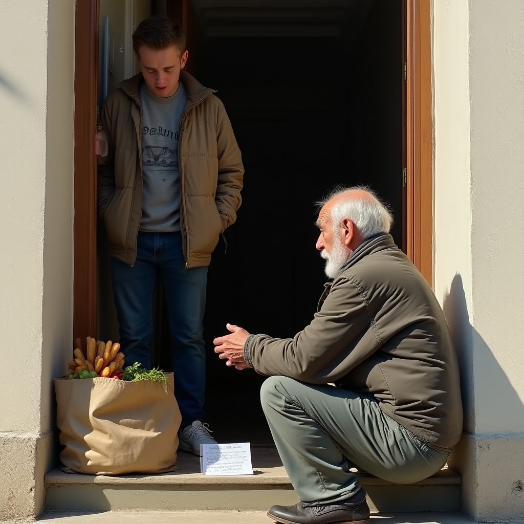 Он вышел на холод, и запах мокрой земли внезапно ударил в нос, заставив сердце биться чаще; у подъезда на старой скамейке сидел мужчина в поношенной куртке, притулившийся к стене. Его лицо было покрыто сединой, а руки дрожали так, что пакеты с продуктами внутри шуршали как бумажные волны. «Возьмите, пожалуйста», — протянул наш герой, чувствуя, как пальцы мёрзнут, и услышал слабую благодарность: «Благодарю, сынок, Бог вам даст». Внутри всё сжалось: его ладони были холодны, а внутри цвели эти знакомые мурашки и горькая улыбка совести.