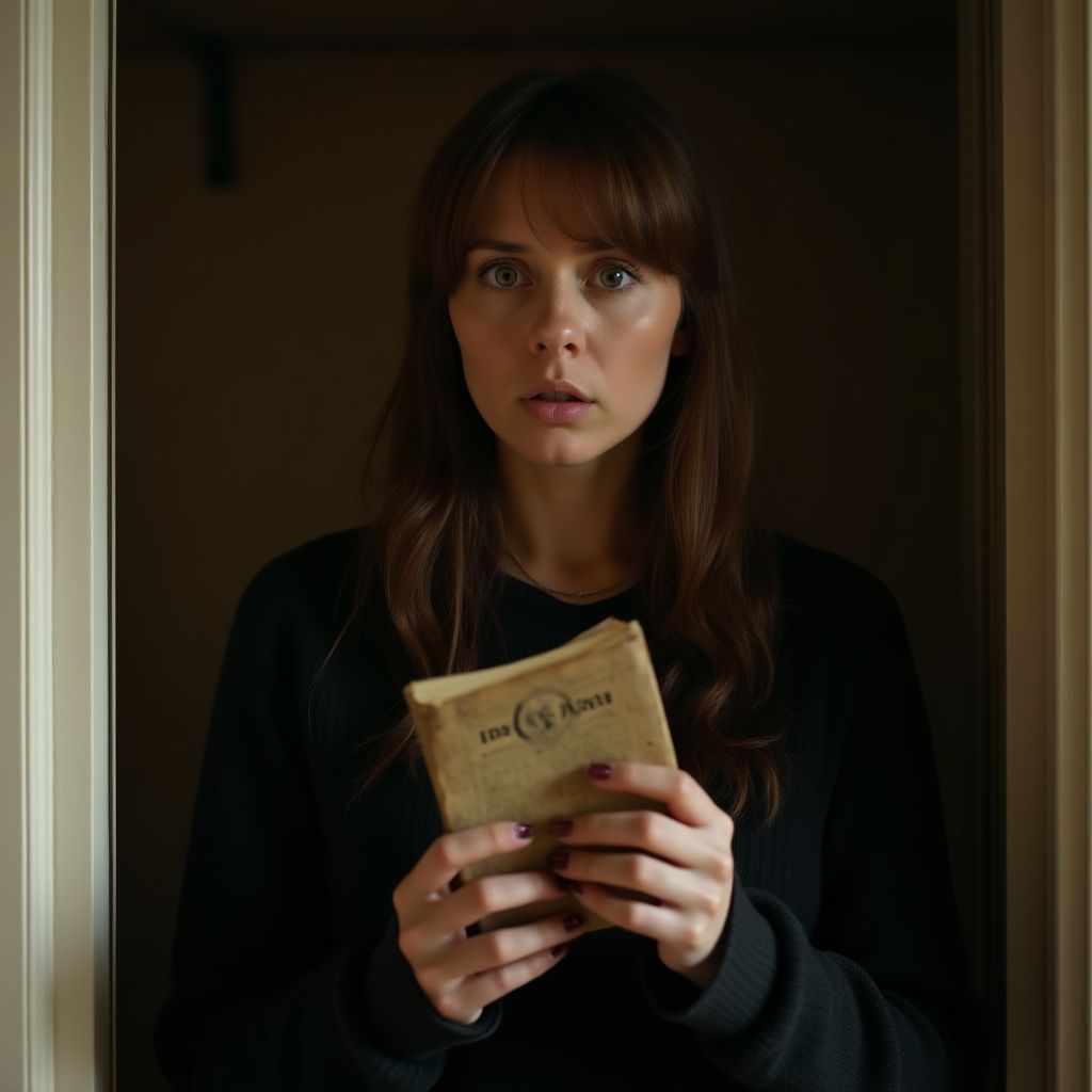 Дверь застыла на последней ноте хриплого скрипа, когда взгляд женщины встретился с потускневшими страницами старого дневника в ее руках. Сердце билось так громко, что казалось — его слышат все вокруг. Она глубоко вздохнула, нерешительно проводя пальцем по пожелтевшей бумаге. Все помещение наполнилось холодным свечением ночника, и зловещая тишина давила, словно свинцовое одеяло.