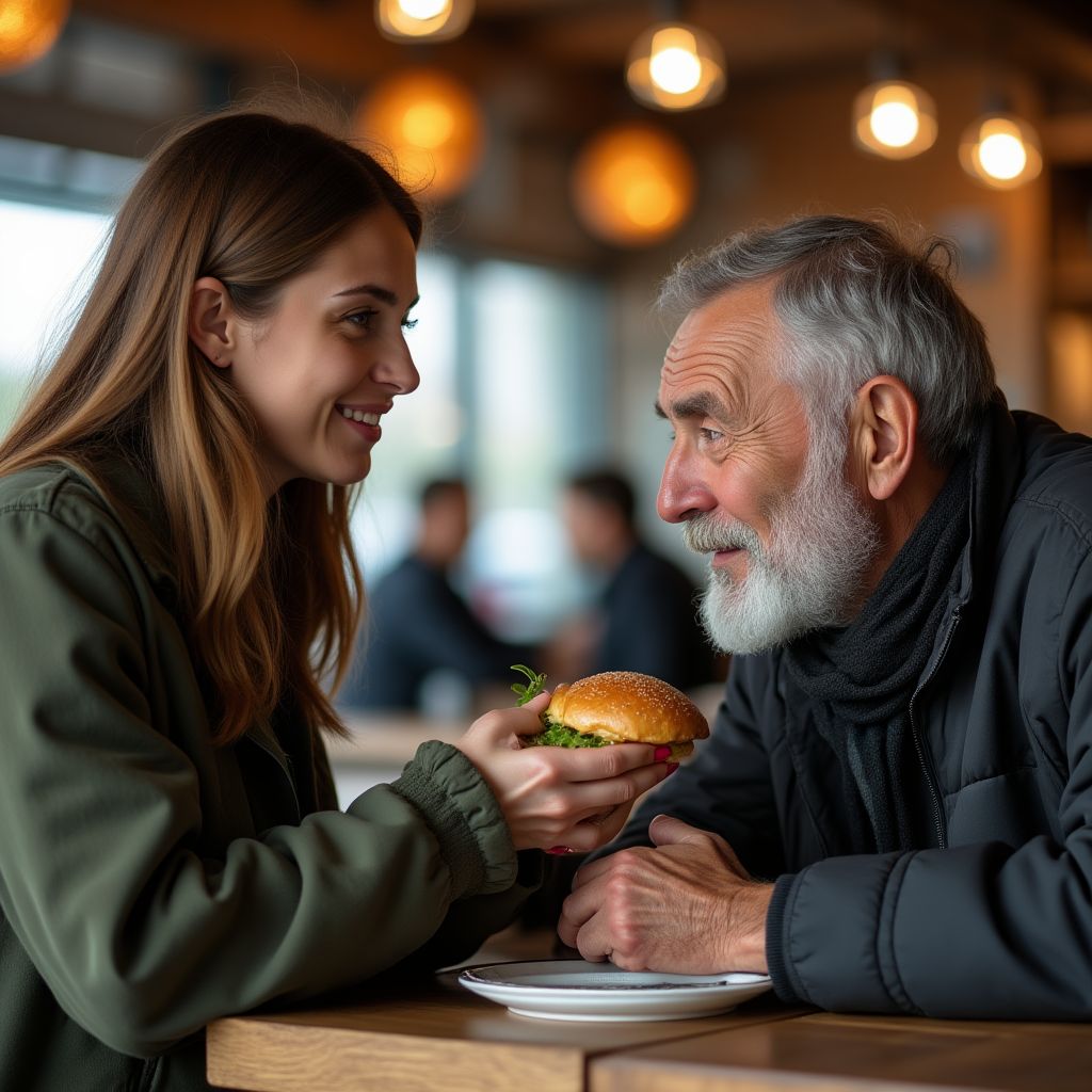 В глубине души было тревожно и тяжело. Сегодня она оставила для себя всего один последний сэндвич — тёплый, недавно сделанный, который мог бы стать лёгким обедом, но судьба распорядилась иначе. Время поджимало, смена уже закончилась, настроение было на самом дне. Её мысли беспокойно метались: как дотянуть до следующей зарплаты, как помочь больной матери, как сохранить то немногое достоинство, которое осталось. В это мгновение перед кафе появился бездомный мужик, мокрый и худой, со взглядом, полным усталости и боли.