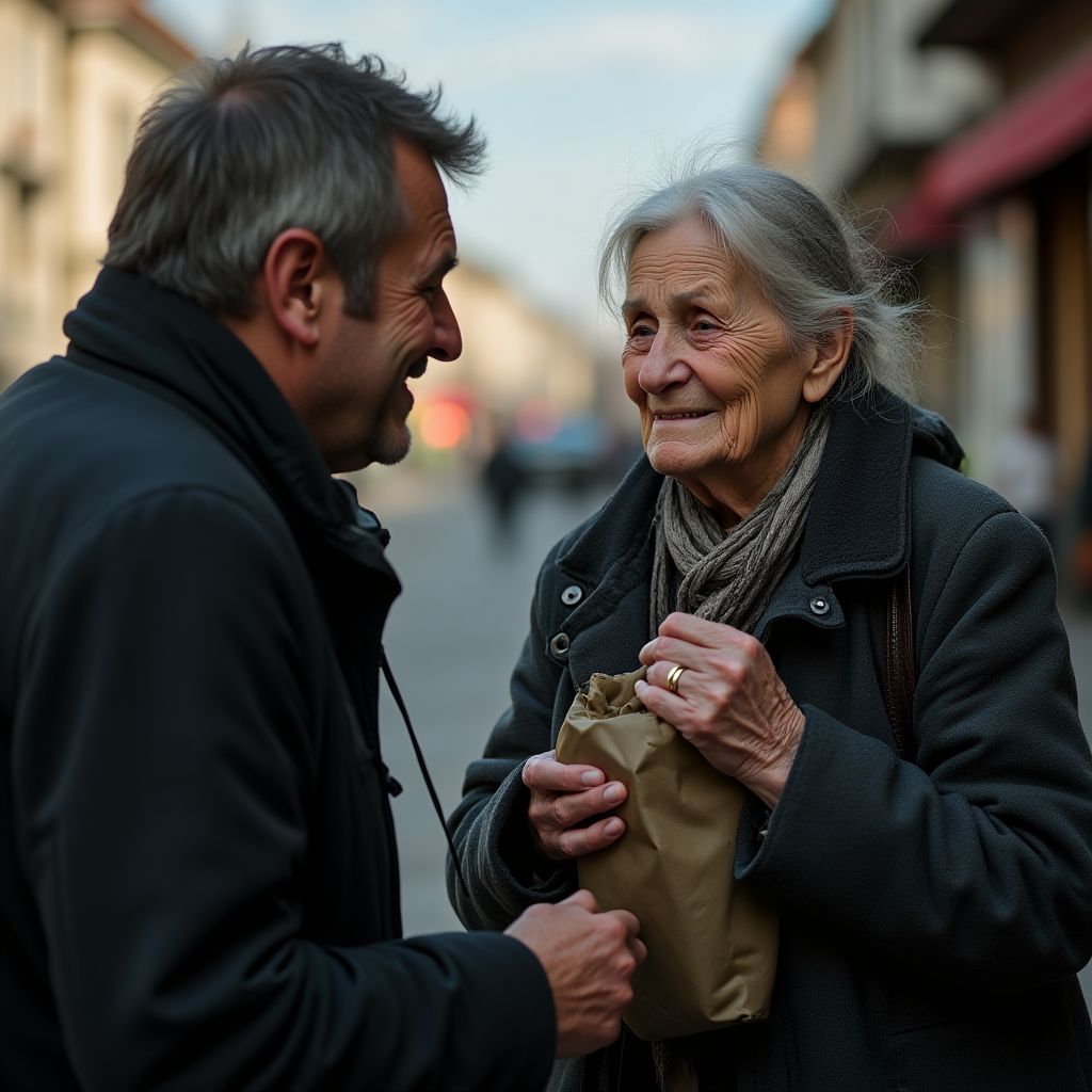 Серое утро опустилось на рынок, словно тяжёлое одеяло, сковывая всё вокруг своей сырой прохладой. Звонкий гул торговых рядов был приглушён редкими стуками и шелестом свежих овощей в коробках, смешиваясь с едва уловимым запахом пряных трав и влажной земли. Тусклые лучи сквозили через редкие облака, отбрасывая на тротуар пятна света и тени. По углам торговой площади скопились группы нищих и торговцев с усталыми лицами, а мелодичный шум голосов сливался с негромким гудением редких проезжающих машин. Именно здесь, у самой узкой улочки рынка, старая бабушка сидела на корточках, тихо рыдая, прижимая к себе иссохшую кожаную сумку.