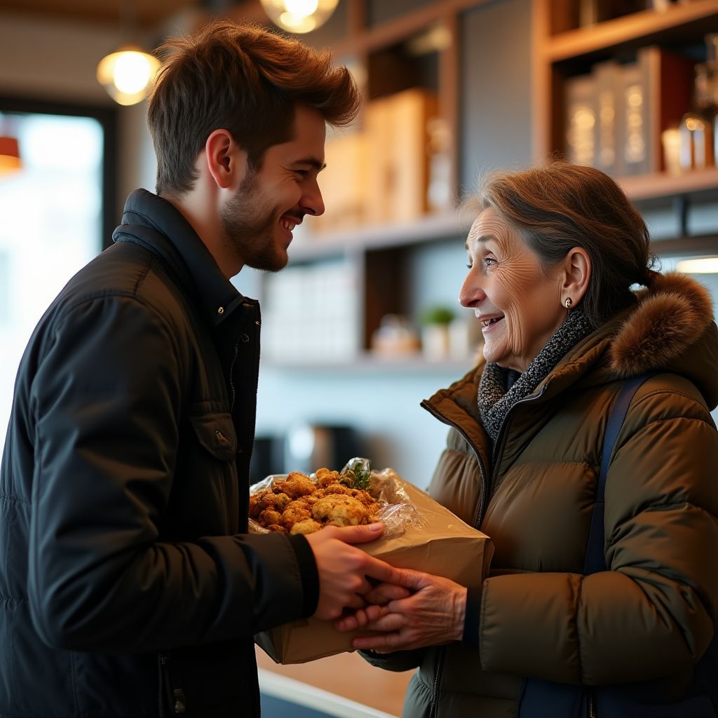 В этот момент к кафе приблизилась бездомная женщина. Ее одежда была грязна и порвана, а лицо покрывал лёгкий налёт пыли и усталости. Она тихо попросила обед у проходящего мимо, но большинство прохожих лишь отвернулись или равнодушно прошли дальше. Парень, заметив её, быстро подошёл и сказал: «Дайте я вас угощу. Сегодня оплатил обед — просто так». Женщина опешила, глядя на него широкими испуганными глазами.