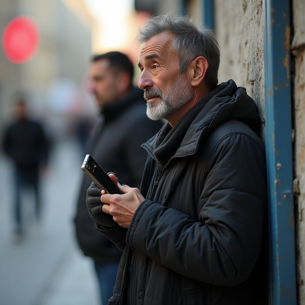 Пожилой мужчина ростом чуть выше среднего, с глубокими морщинами на лице и глазами цвета мутного янтаря. Его пальцы были тонкими и покрыты мозолями, а обувь давно потеряла форму и цвет. На груди висела потрёпанная сумка, из которой торчала тряпичная бутылка с водой. Осанка была согнутая, словно длинные годы всей жизни тянули его вниз. Он явно не принадлежал к этому шумному месту — слишком грязный и забытый, словно невидимка среди оживленных прохожих. «Нужно найти способ дозвониться», — думал он, отчаянно надеясь на добро случайного человека.