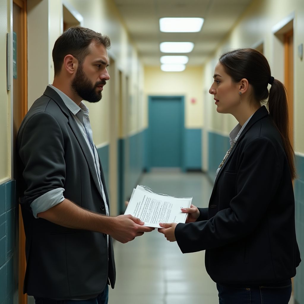 Когда он вошёл в здание, напряжение ощутимо выросло. В коридорах стоял запах чистящих средств, перемешанный с резким ароматом краски и старых деревянных парт. Свет лампочек казался чрезмерно ярким, будто отражая неловкость происходящего. Вдруг из соседнего кабинета к нему шагнула учительница: женщина средних лет, строгая, в аккуратном костюме, с глазами, которые одновременно глядели в душу и не отпускали.