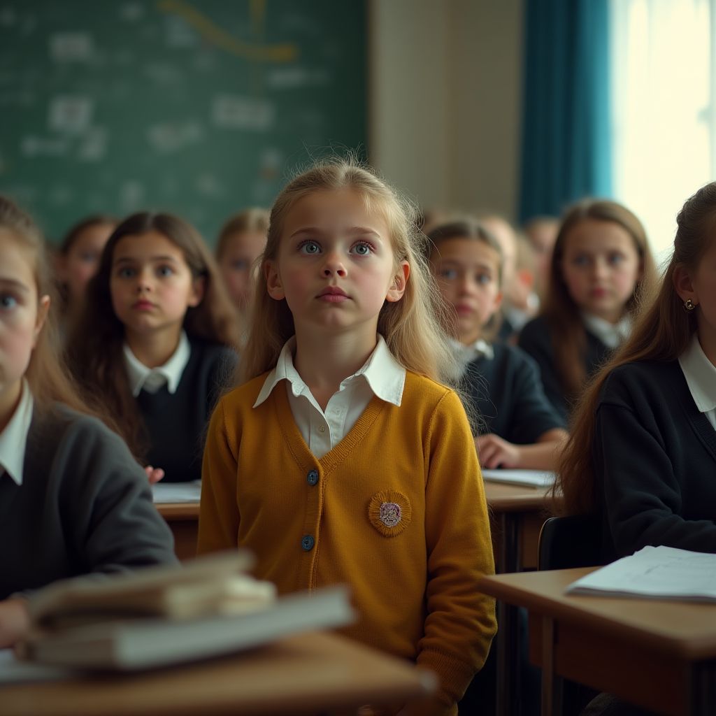 За первой партой сидела Лена — хрупкая девочка с бледным лицом и большими тёмными глазами, в которых таилась история длиной в целую жизнь. Её тонкие пальцы нервно играли с краем старого свитера, чуть заметно изношенного и вечно слишком большого. Ростом ниже сверстников, в простых джинсах и поношенной кофте, Лена казалась воплощением уязвимости и скромности. Её взгляд часто устремлялся в окно, словно она искала там спасение от жестоких слов одноклассников. Сегодня в её глазах читалась усталость — усталость не только от уроков, а от постоянного чувства неполноценности и незаметности среди сверстников.