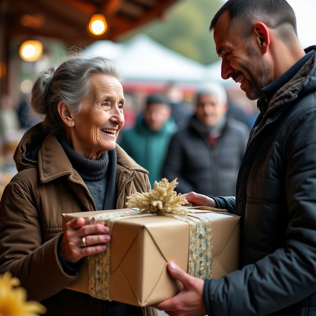 На одном из углов рынка, у прилавка, покрылого выцветшей скатертью, стояла хрупкая старушка с седеющими волосами, собранными в тугой пучок. Её глаза — глубокие, слегка покрасневшие и усталые — выдавали жизненный опыт и невысказанную боль. В её руках был тщательно завернут свёрток, украшенный небольшой яркой лентой. Несмотря на простую, изношенную одежду — тёмно-синий шерстяной платок, поношенный плащ и старые ботинки — в её движениях чувствовалась сдержанная уверенность и осторожность.