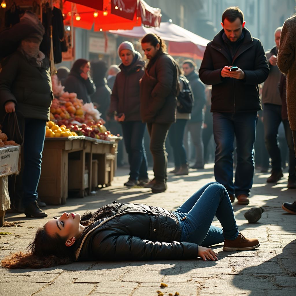 Вдруг, едва она успела опереться на прилавок, ноги предательски подкосились, и тело рухнуло на землю. Тишина, как тяжелое свинцовое покрывало, опустилась на рынок — вдруг все головы поднялись от экранов телефонов. Прохожие замерли, затаив дыхание. Никто не спешил помочь. Все взгляды устремились на неё, как будто внезапно кто-то нажал на невидимый выключатель и заставил всех почувствовать общую человеческую ответственность, которую они так долго игнорировали.