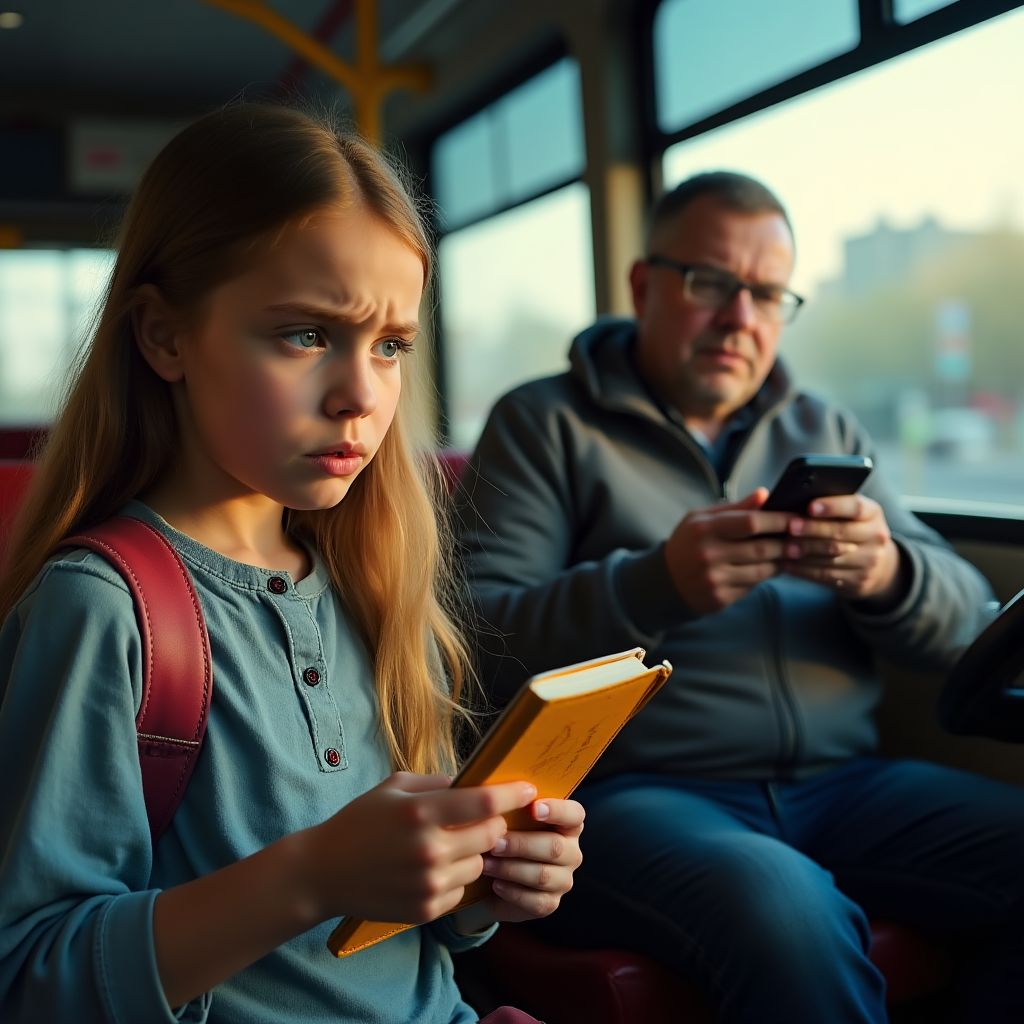 Среди них была девочка лет двенадцати, худенькая с запорошенными сединой каштановыми волосами, её тонкое пальто с выцветшими пятнами едва защищало от сырости. Большие тёмные глаза исследовали пространство, скрывая тревогу и усталость, а из-за гладкой складки на лбу можно было прочесть её внутреннюю борьбу. В руках она сдавала скромный дневник с замком — её единственную защиту и секретный мир от внешнего жестокого мира, в котором она жила. Девочка молча держала время, её мысли бежали далеко за пределы этого автобуса — к школе, к дому, к мечтам, которые казались невероятными и недосягаемыми.