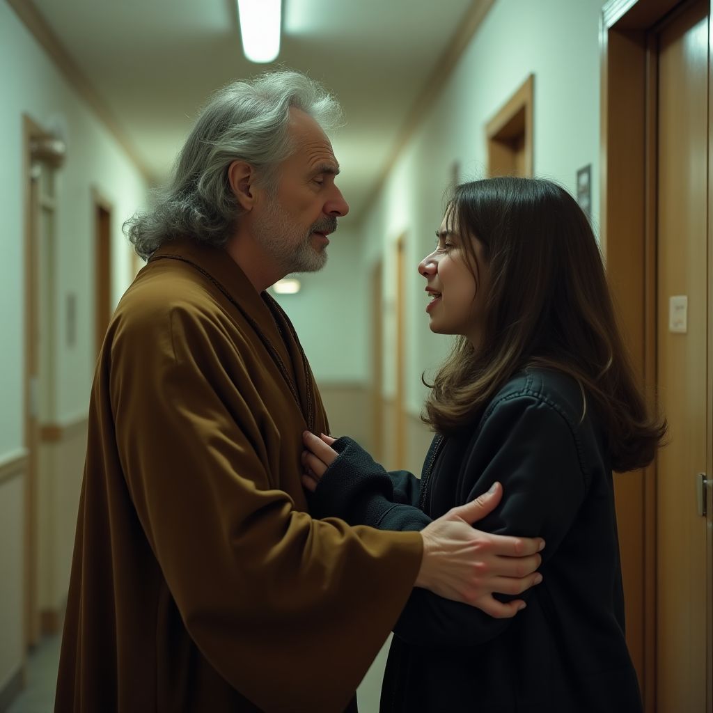 «Я знаю, что выгляжу нелепо,» — заговорил он с тихим голосом, который звучал словно эхо в пустом зале ожидания. — «Этот халат… он всё, что у меня осталось. Я болен, после того как потерял работу, меня выгнали из дома. Я приходил в больницу, в поликлинику, но никто не помог. Я не смог дать тебе лучшее детство, но всегда думал о тебе.»