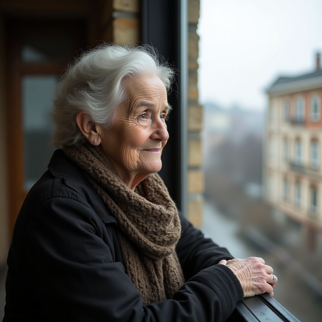 В этот момент на разбитом балконе появилась она — пожилая женщина с глубокими морщинами и усталыми глазами цвета серого неба. В пальто, слишком старом и поношенном, словно отражающем её судьбу, она медленно вышла из квартиры, будто впервые за долгие годы осмелившись нарушить тишину. Её седые волосы аккуратно убраны, а плечи несут груз одиночества и потерянных мечтаний. Взгляд её был насторожен, смешан с тоской и чем-то неуловимо решительным. Она прижалась к перилам, ощупывая холодный металл, который столь же неприветливо принимал её, как и весь этот мир за окном.