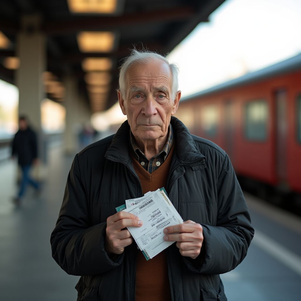 Старик высокий, с измождённым лицом, покрытым морщинами, словно каждая из них была записана в дневник его жизни. Серые волосы тщательно зачёсаны назад, одежда — дорогой, но потёртый плащ и изношенные ботинки — подчёркивали контраст между материальным положением и внутренним состоянием. В его руках дрожали два билета в первый класс, купленные заранее, чтобы избежать любопытных взглядов. Он медленно осматривал зал ожидания, и в каждом движении ощущалась скрытая решимость и немое прощание с прошлым.