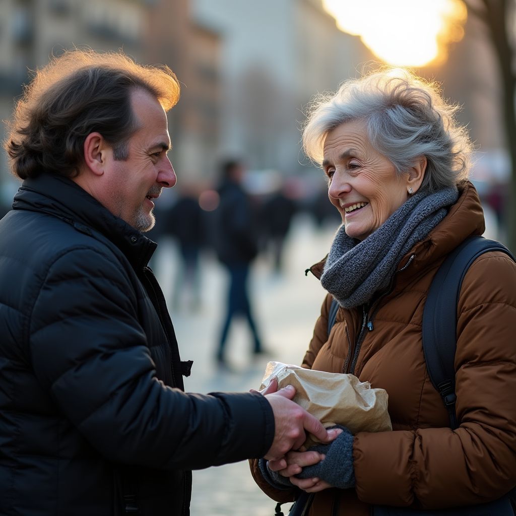 Среди проносящихся мимо людей выделялся мужчина лет сорока. В его одежде можно было прочесть всё: потёртая куртка с заметными пятнами, износившиеся ботинки и небрежно наброшенный шарф. Высокий, с усталым взглядом, он часто останавливался, опуская глаза, словно стараясь спрятаться от мира. Этот обычный прохожий остановился у лавки, когда женщина тихо протянула ему пакет, произнеся: «Возьми, пожалуйста, тебе пригодится.» Его сердце дрогнуло, не веря простому жесту из уст незнакомки в этом сером мире. Он принял пакет, и женщина исчезла так же быстро, как появилась.