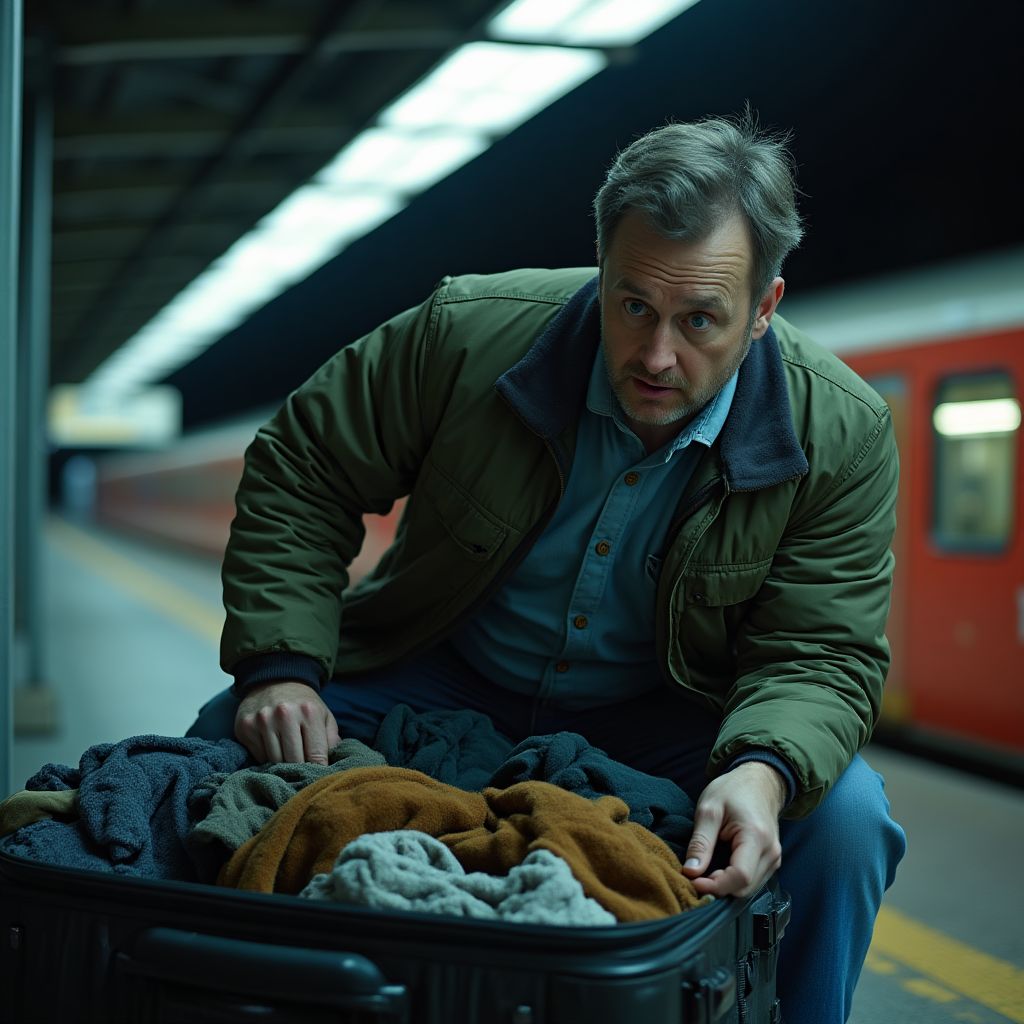 Подойдя к скамейке, мужчина сел, оглядывая пустую платформу. К нему подошли двое рабочих — мужчины в грязных куртках и выцветших касках, едва сдерживавшие любопытство. «Что у тебя там?» — прорычал один из них, глаза блестели от неожиданности. «Это не твоё дело,» — тихо ответил мужчина, сжимая ручку чемодана чуть крепче. «Просто отойди,» — добавил он, но голос дрожал. Рабочие не отступали, их тени подбадривали друг друга: «Может, там спрятано золото? Или что-то похуже?» Легкая дрожь пробежала по спине главного героя — он видел в их глазах смесь угрозы и интереса.