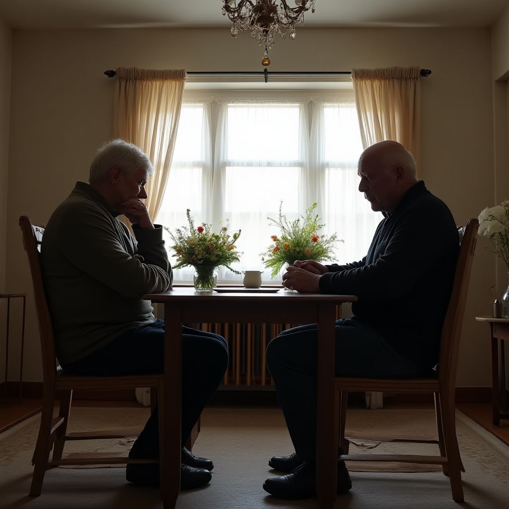 Она — невысокая женщина в потёртом пальто, с седыми прядями у лица и глазами, полными потаённых надежд — держала в руках букет полевых цветов. Его слабая фигура казалась всё более запущенной — долгое расставание с жизнью отбросило прочь былую силу и уверенность. Его руки, в которых дрожала тёплая перчатка, не отпускали её даже на мгновение. Вокруг раздавались приглушённые звуки шагов прохожих и редкие взгляды соседей, переходящих улицу, словно боясь нарушить священную тишину.